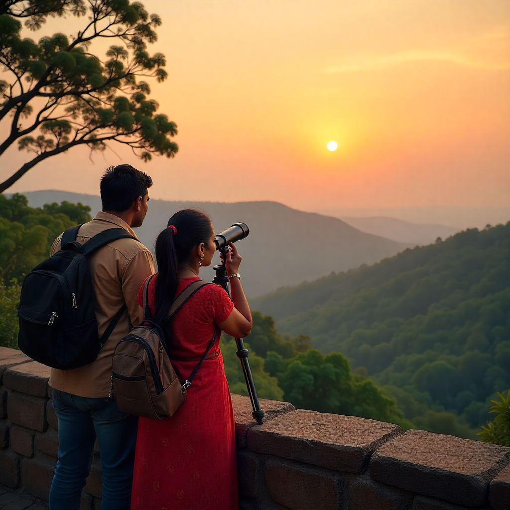 A Telescope Point at a fort is a special viewing area where visitors can look at distant landscapes, historical monuments, villages, rivers, temples, and surrounding mountain ranges through a mounted telescope. It enhances the sightseeing experience by showing fine details that are not visible to the naked eye.